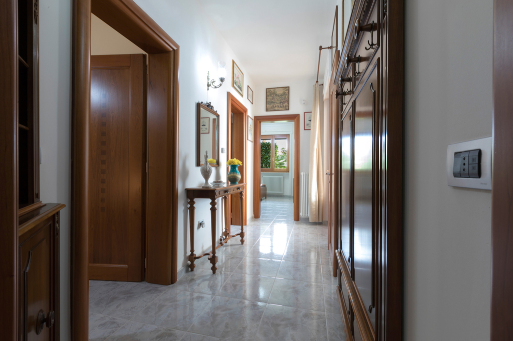 Al piano terra vi è la zona giorno, formata da cucina con angolo cottura ,impianto hi-fi e libreria, e la zona notte, con 3 camere da letto (1 matrimoniale, 1 doppia con 2 grandi letti alla francese e una con 2 letti singoli), 2 bagni, di cui uno con doccia e uno con vasca.