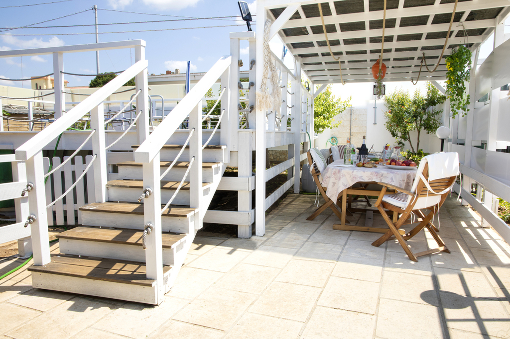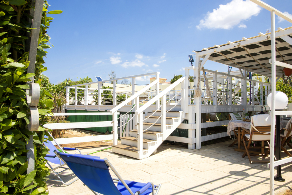 Il giardino è abbellito da aiuole con piante e alberi. Adiacenti al tinello è disponibile un ampio porticato in legno, dotato di ventilatore a soffitto ed un ampio tavolo, che consente di pranzare e cenare all'aperto. Gli interni sono accoglienti e spaziosi.
