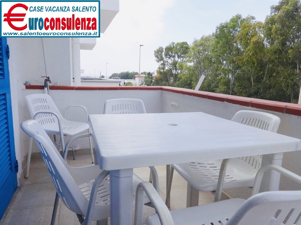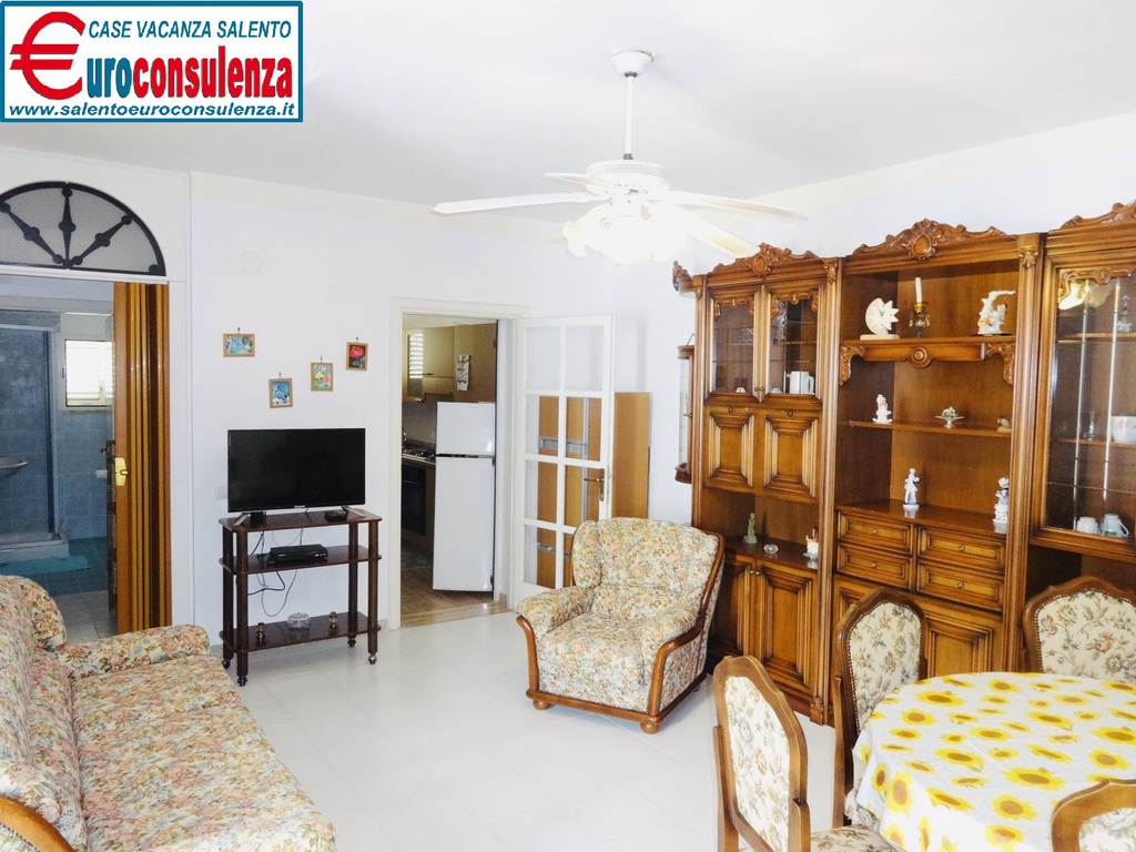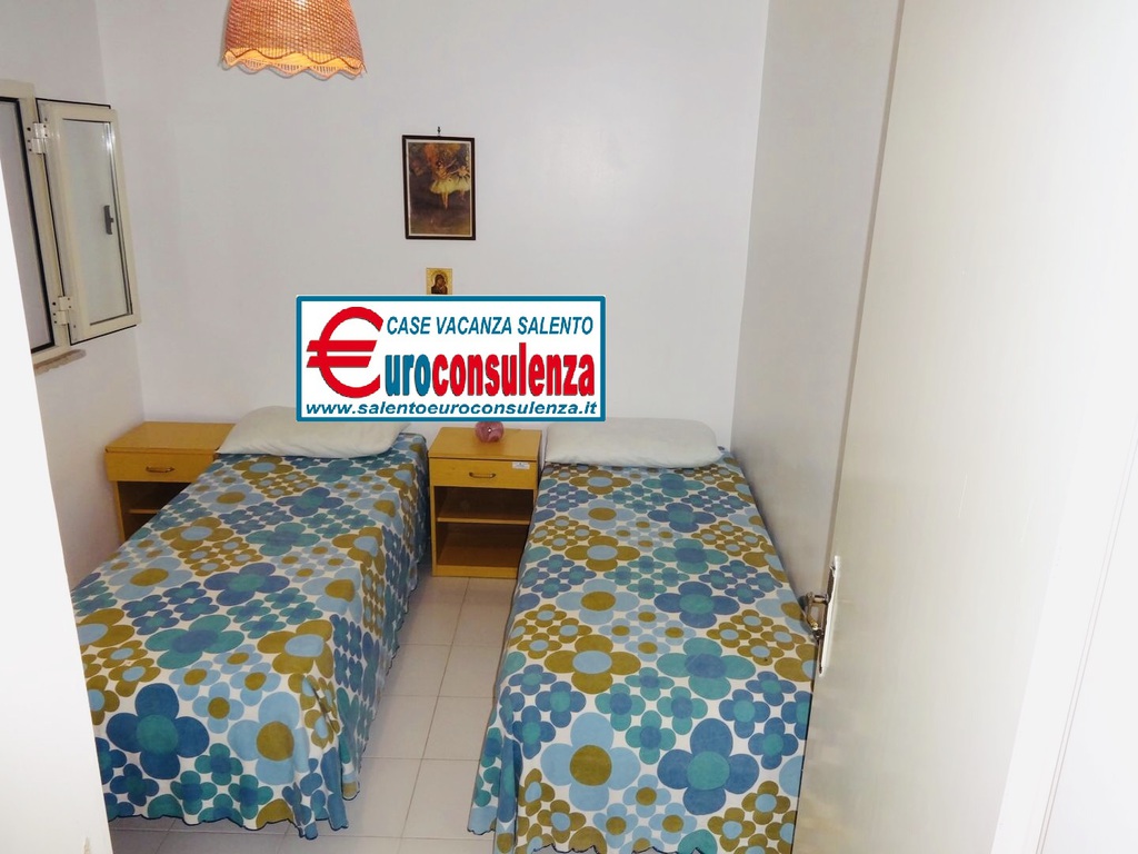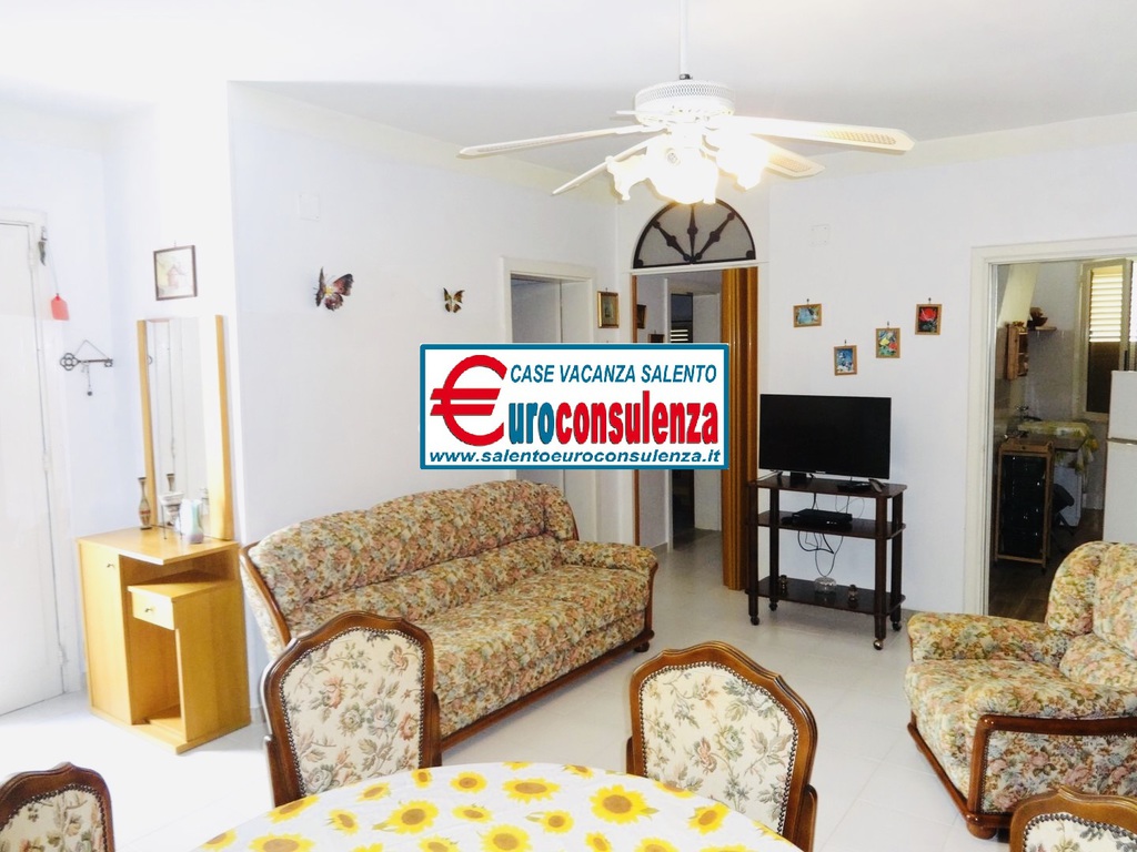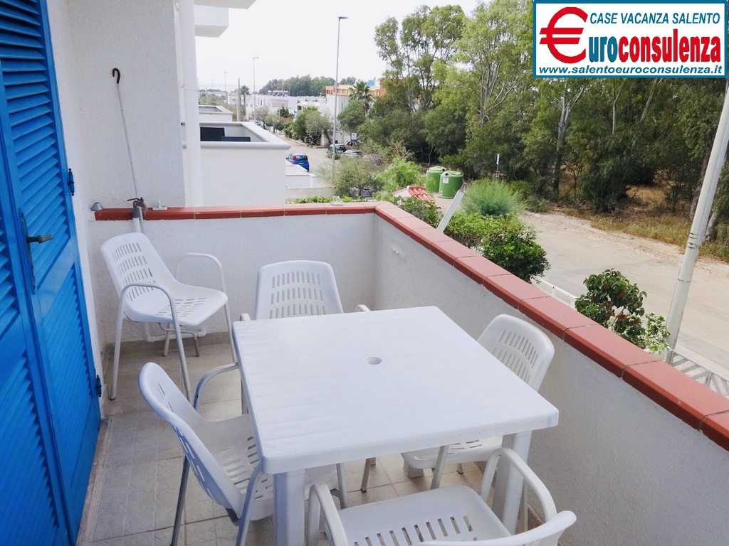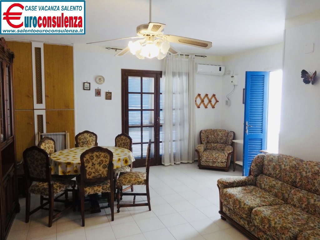 Appartamento con aria condizionata a circa 400 metri dalla favolosa spiaggia composto 2 camere da letto, una con letto matrimoniale e l'altra con due letti singoli, sala pranzo con divano letto, cucinotto, bagno con doccia box, verandina coperta e attrezzata con mobili da giardino per poter mangiare all'aperto, per un totale di 6 posti letto, zona molto ben servita arrivabile a piedi in spiaggia, supermercati, pizzerie, ristoranti, negozi, soluzione ideale per chi intende trascorre le vacanze nel salento in pieno relax e avere tutto a disposizione nelle vicinanze.
