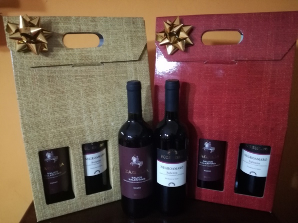 I VINI IN BASE ALLA DISPONIBILITA' POTRANNO ESSERE SOSTITUITI DA ALTRI SEMPRE AUTOCTONI COME IL MALVASIA O IL PRIMITIVO DI MANDURIA O ALTRI ,INOLTRE LE VALIGETTE AL RITIRO SARANNO GIA' CONFEZIONATE E PER UNA QUESTIONE DI DISPONIBILITA' NON SI POTRANNO SCEGLIRE I VINI DA INSERIRE A PIACIMENTO.