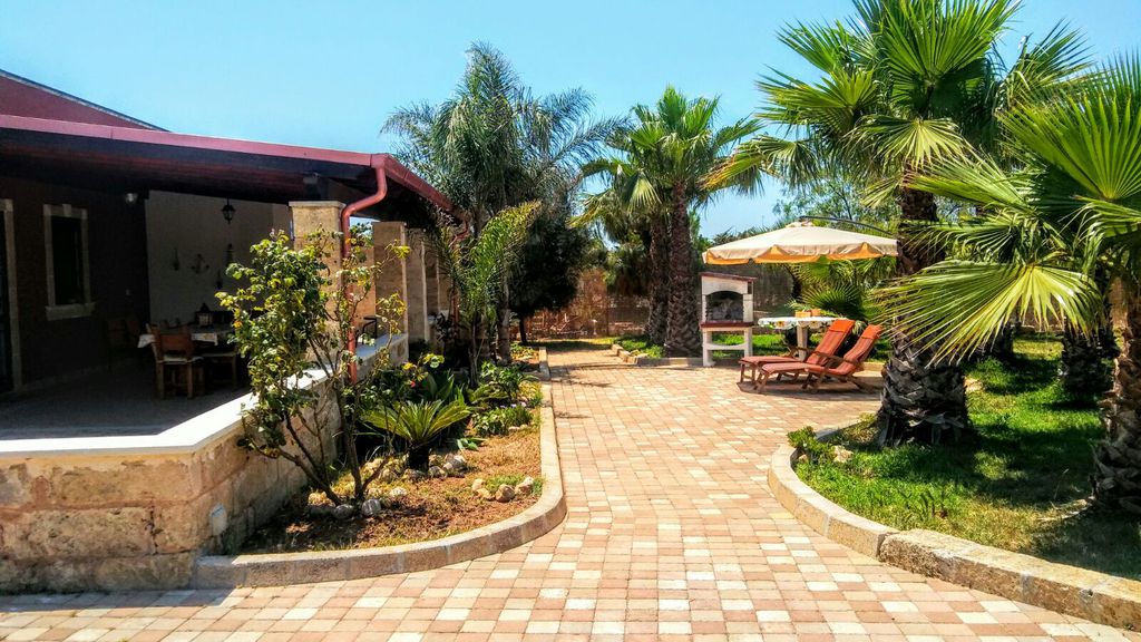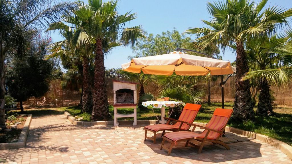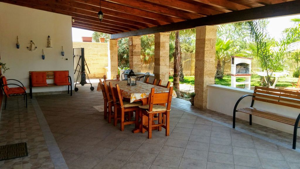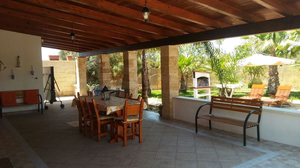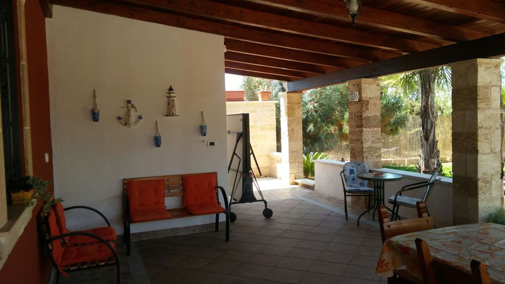 Bellissima villa angolare con due ingressi con aria condizionata a 500 mt circa dalle spiagge sabbiose di T.S. Giovanni, una villa stupenda immersa nel verde tutta al piano terra e formata da: soggiorno/tinello con angolo cottura tutto attrezzato, 3 camere da letto, 2 bagni con doccia di cui uno esterno sotto il gazebo in legno, per un totale di 7+1 posti letto. La villa ha un bellissimo giardino tutto piantumato dove si trovano tutti i mobili da giardino, ombrellone, la doccia esterna, i posti auto coperti e un bellissimo gazebo in legno dove si puo’ pranzare e cenare fuori utilizzando il barbecue. Si mettono a disposizione delle biciclette. Villa completamente indipendente stupenda soluzione per chi vuole trascorrere in completo relax il periodo estivo con nelle vicinanze le piu’ belle spiagge sabbiose del salento.